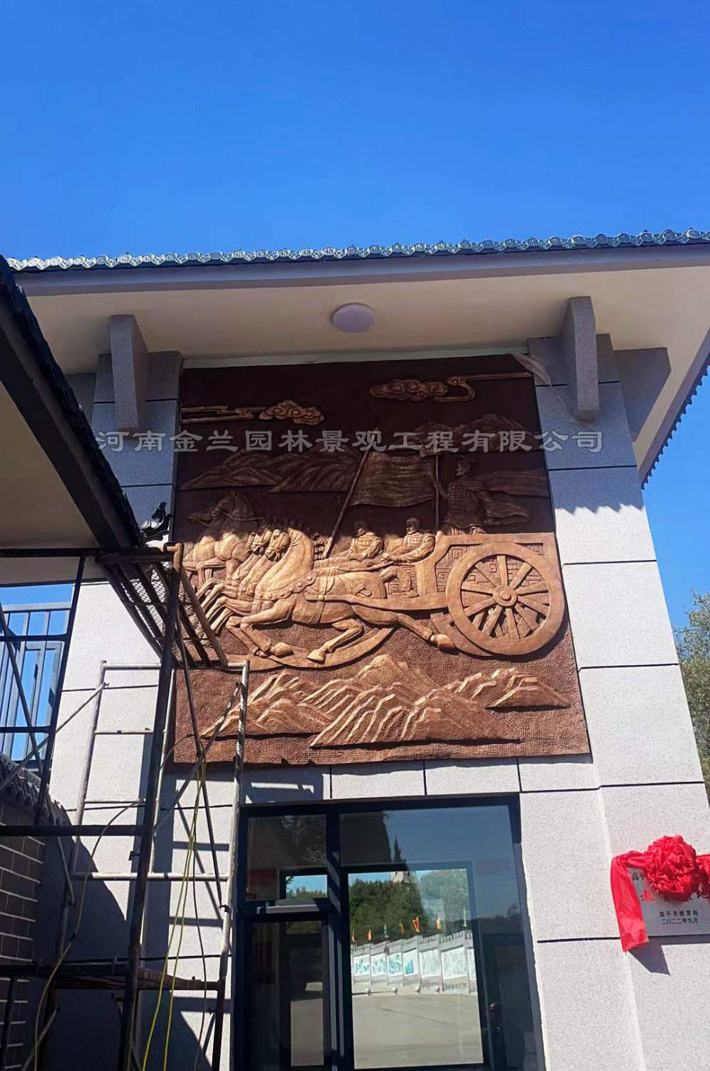 此浮雕案例是为山西长治某景区所做的外墙浮雕,景区位于长平之战的发生地,浮雕表现的也是长平之战的场景,战车飞奔进入战场。浮雕采用玻璃钢材质,后期做仿铜效果处理,因为面积不大,所以做成了一整块,方便后期的安装。